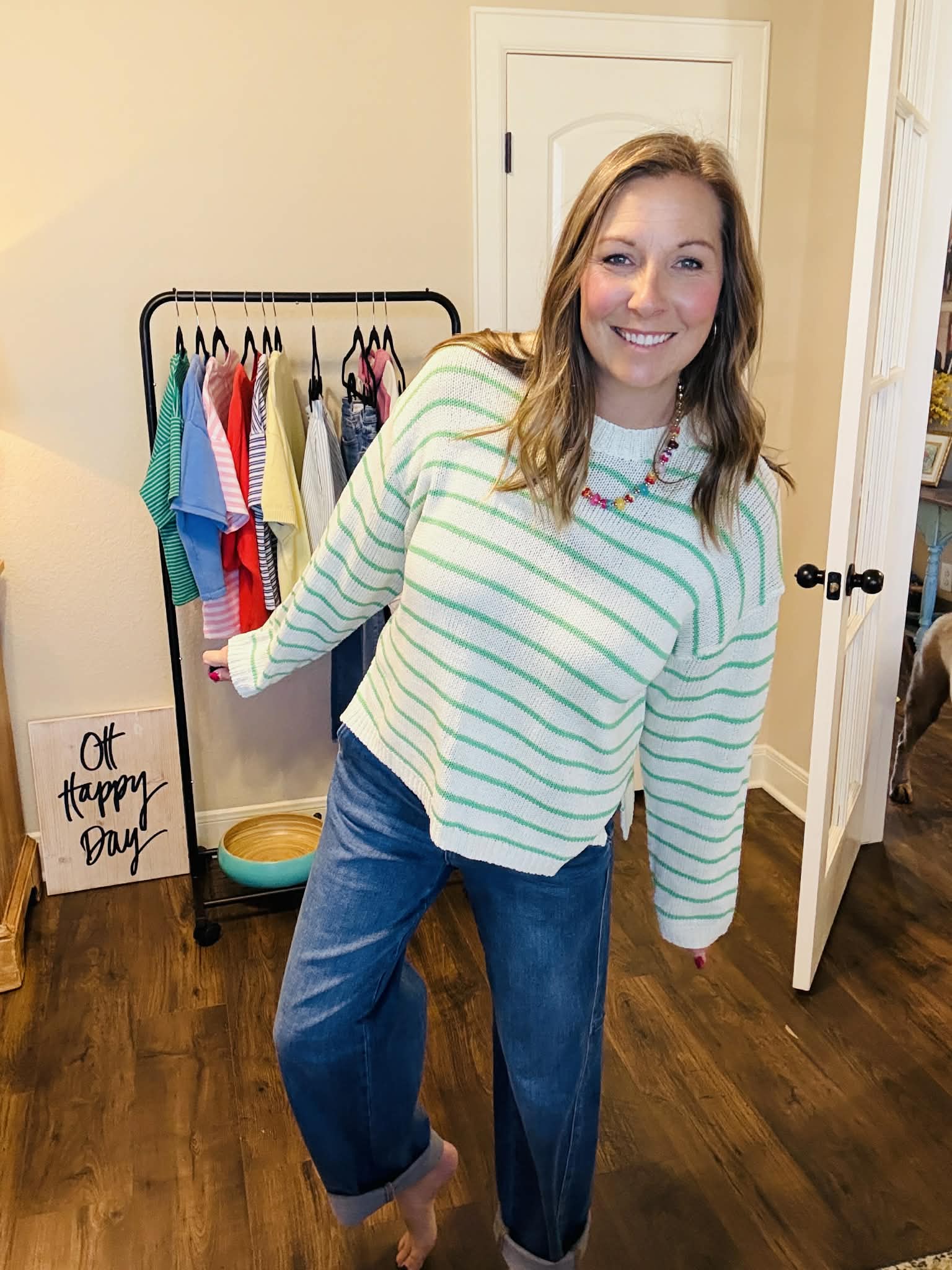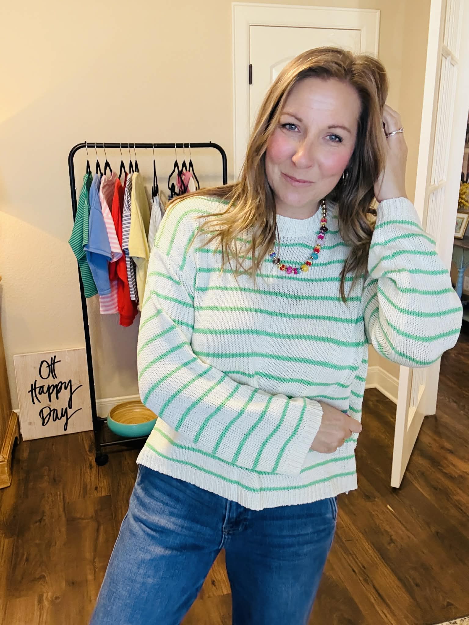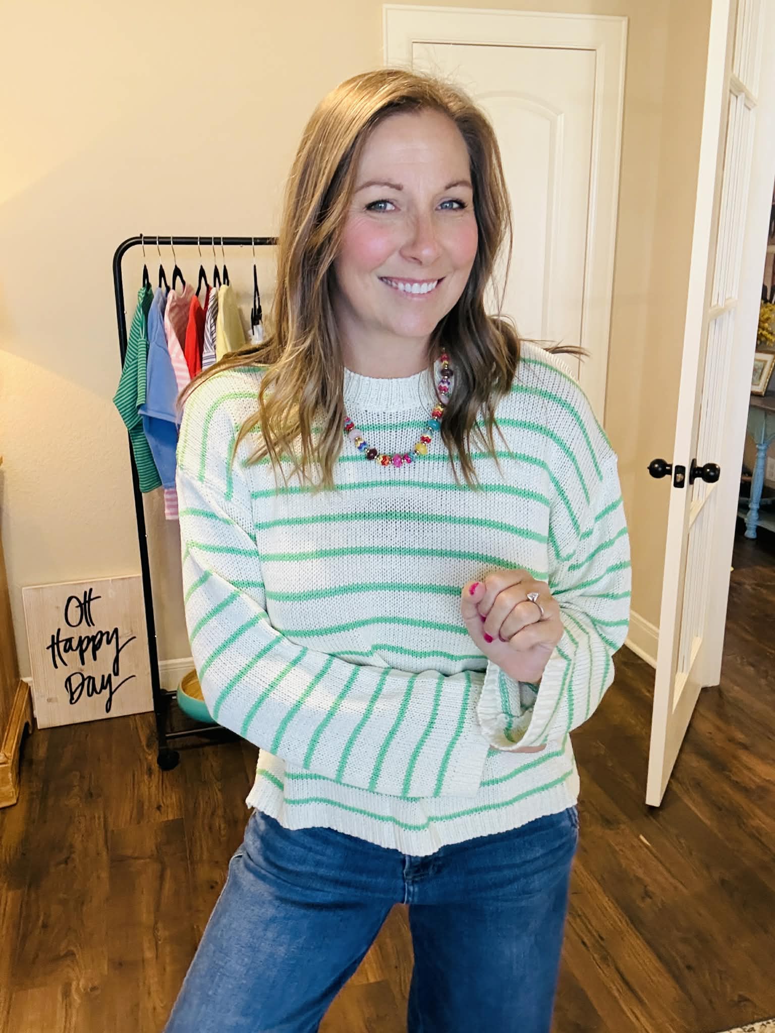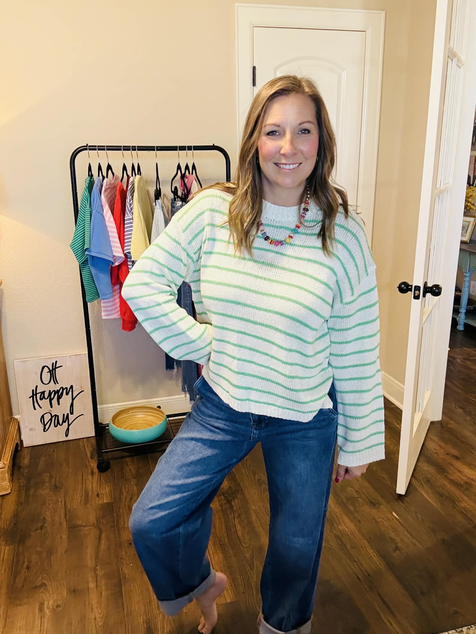 This green apple striped sweater is the perfect lightweight layer for spring days when you want cozy without feeling heavy. The relaxed fit and soft knit make it easy to throw on and go, while the fresh green stripes add just the right pop of color to brighten your outfit.